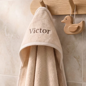 We maken onder andere items voor baby’s en kinderen, zoals badcapes, rugzakjes en dekentjes, maar ook woonitems zoals tegeltjes met tekst of quote. Alles met dezelfde zorg en rustige uitstraling.